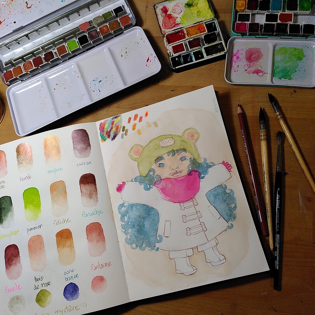 For Christmas (2022) I got some lush presents: the full 150-piece set of Prismacolor Premier colour pencils (from my love) and 12 watercolour half-pans, mostly sparkly 😊️, handcraftde by Le Pigmentarium (from my Mum)! The watercolour came with 4 additional quarter-pans, one of which I really like – unfortunately (or fortunately? 😅️) it was not labelled so I can’t buy more…