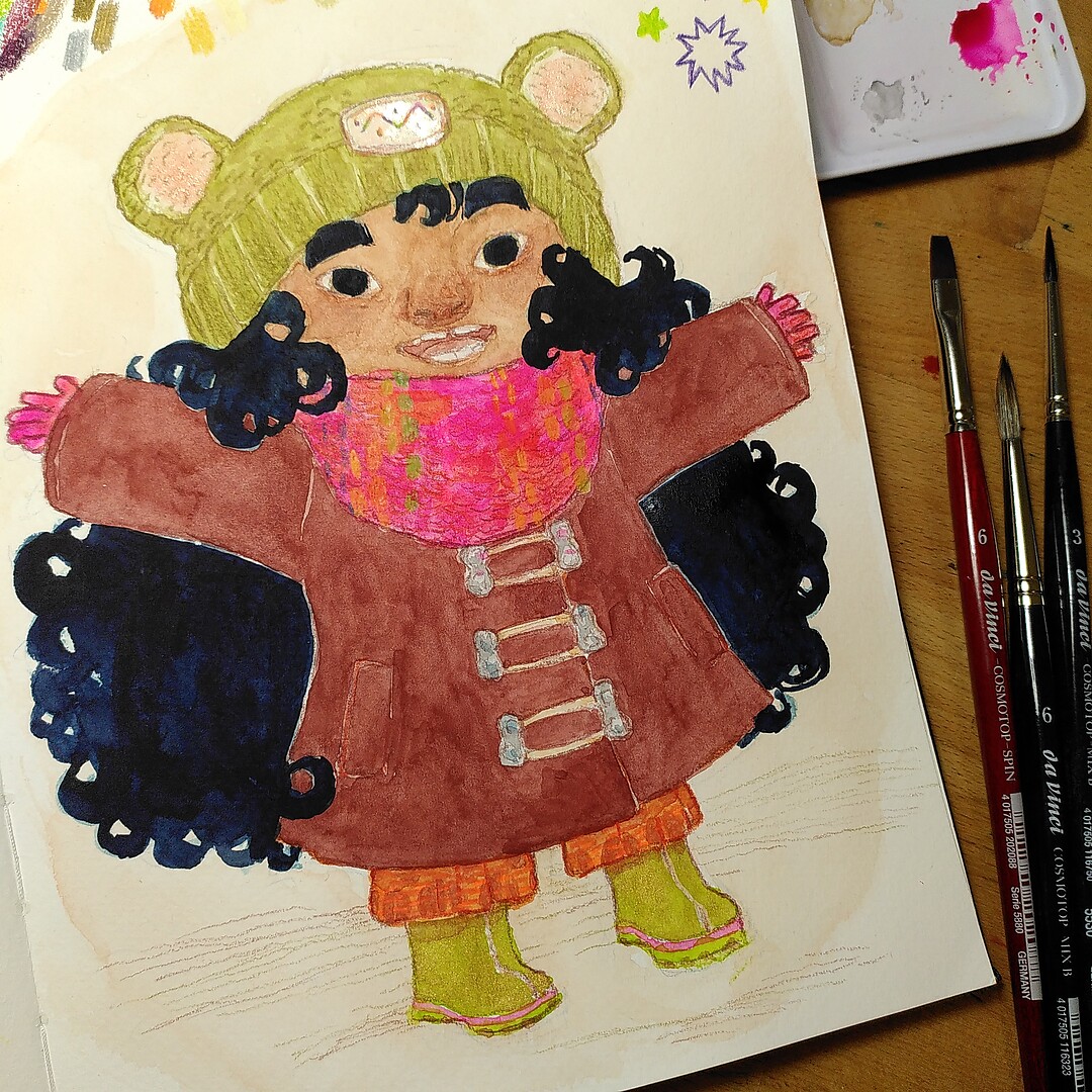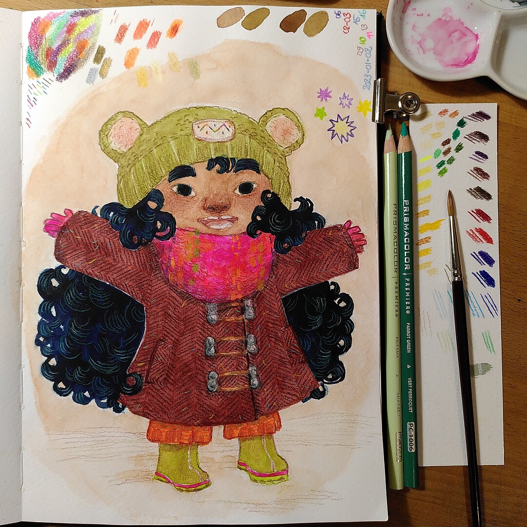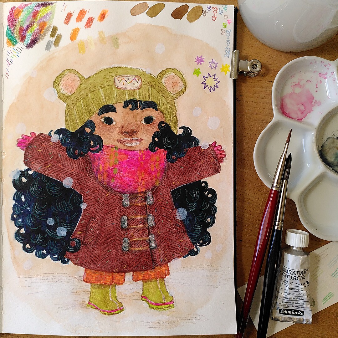 One reply on “Testing new art supplies in my sketchbook: Happy, wintery little girl”