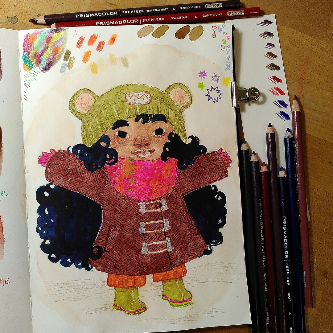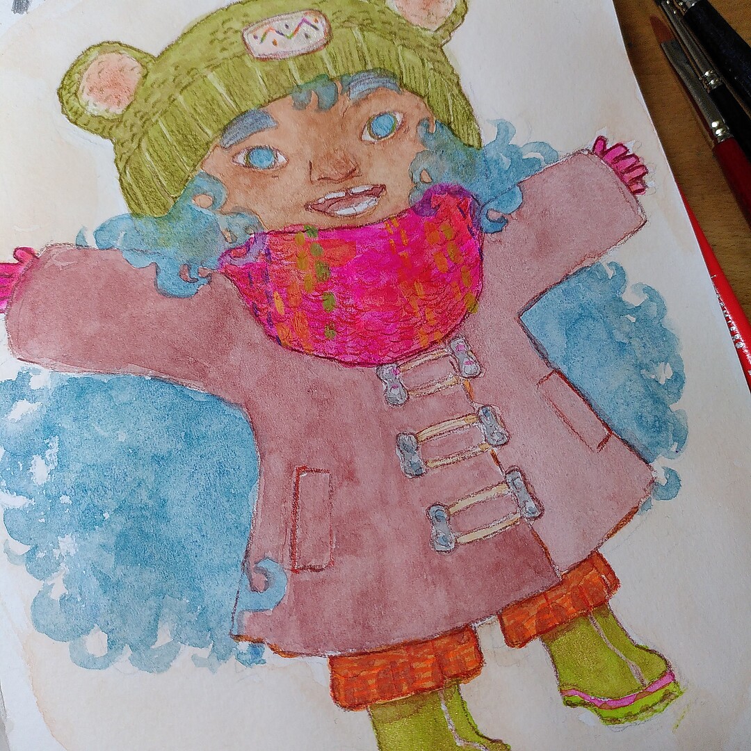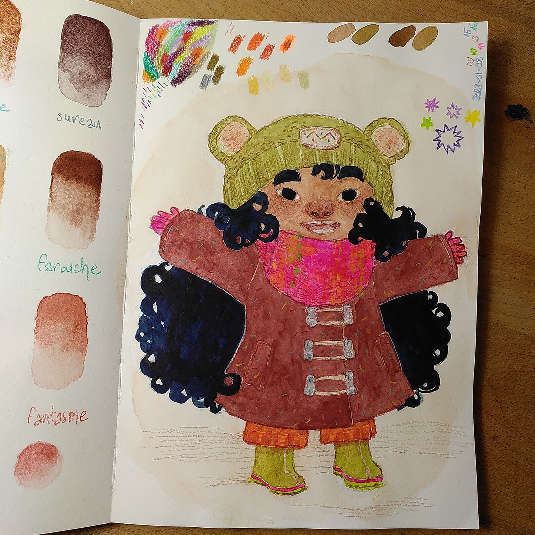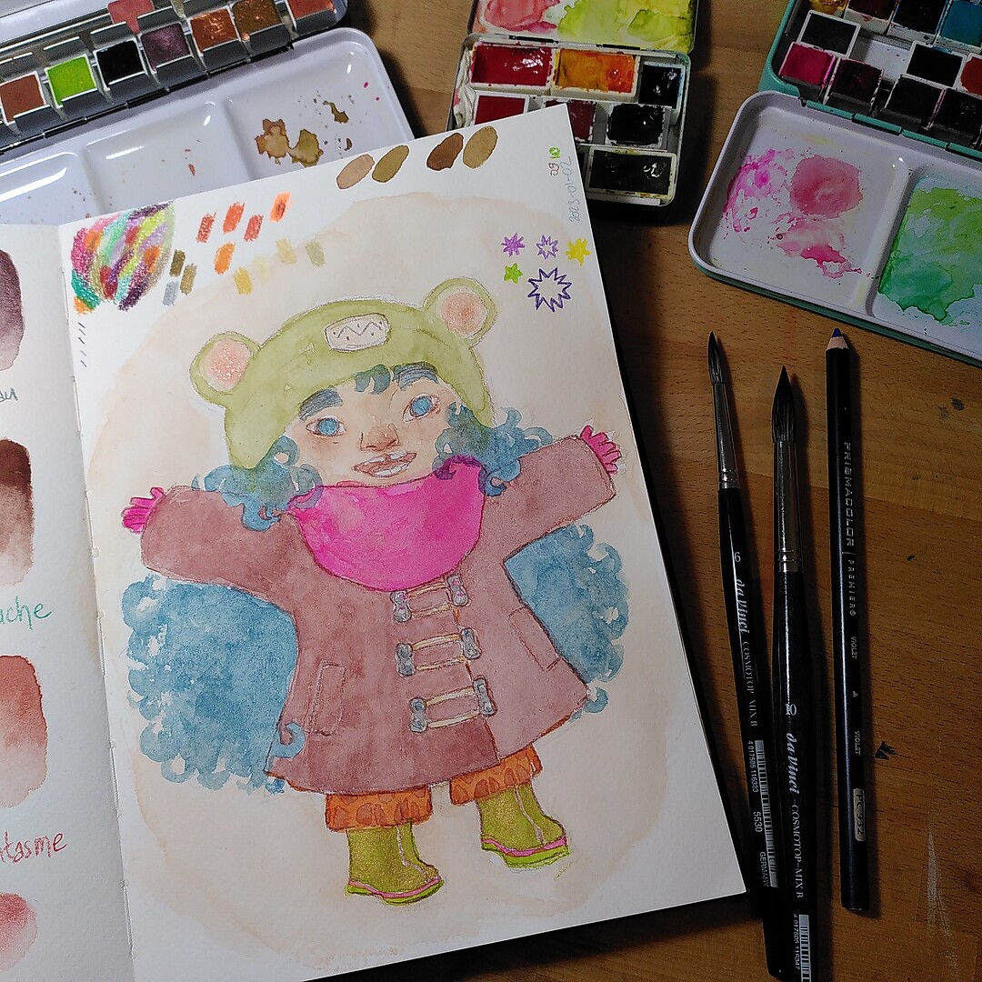 One reply on “Testing new art supplies in my sketchbook: Happy, wintery little girl”