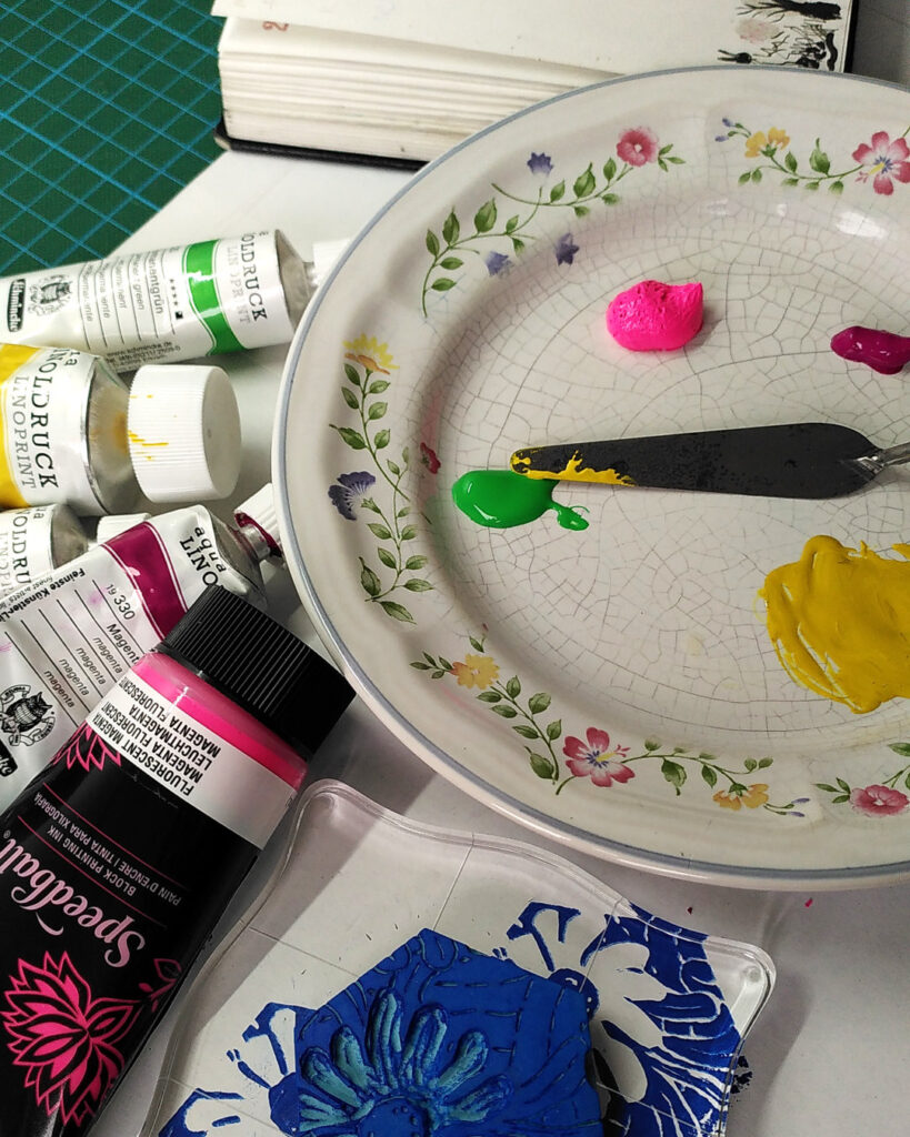 Used a palette knife to mix a little bit of sepia with the yellow to get more of a mustard tone. The colour called magenta is more of a reddish purple straight from the tube, so did not need to mix, and the permanent green is also straight from the tube – gorgeous, right? 🤓️